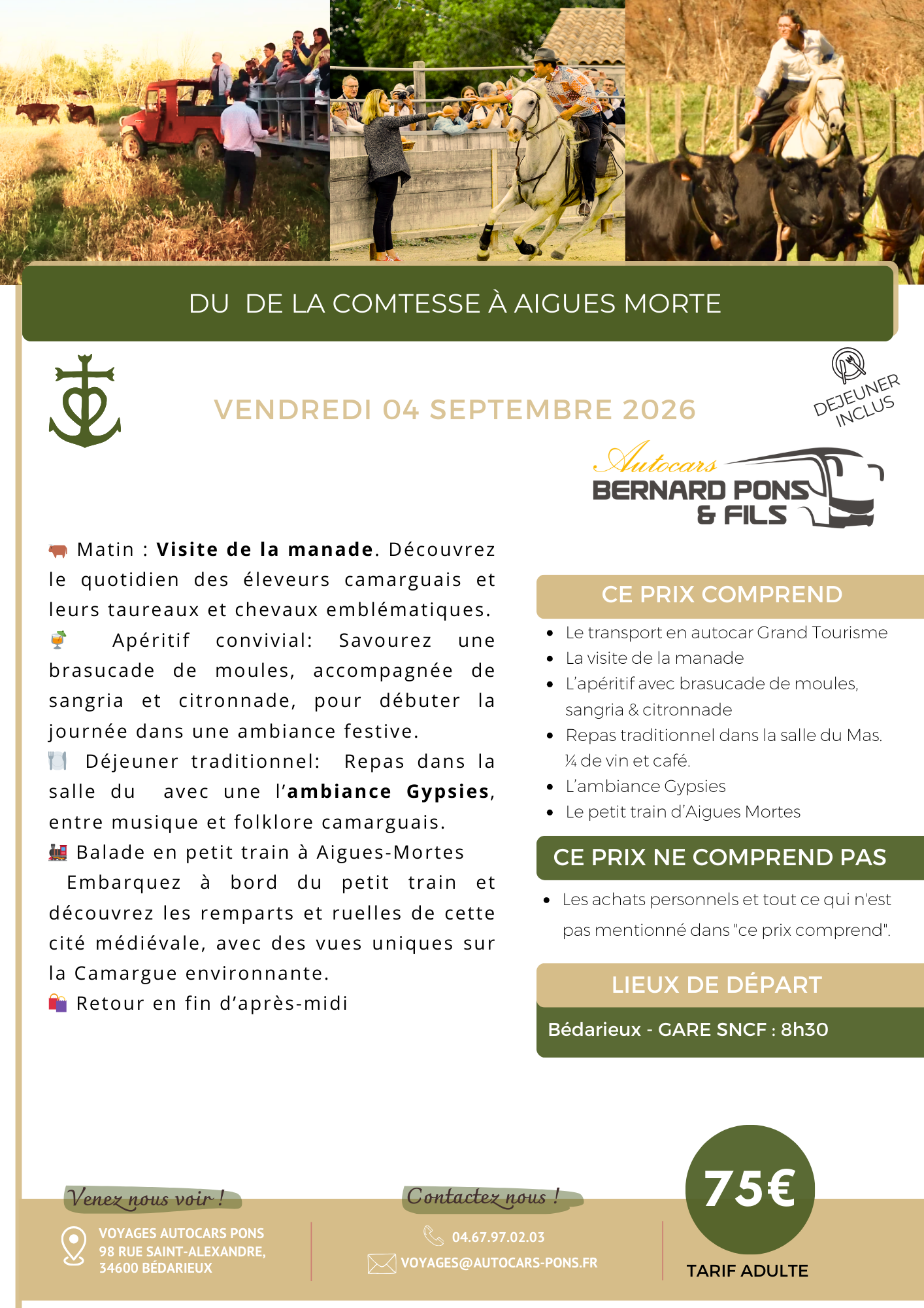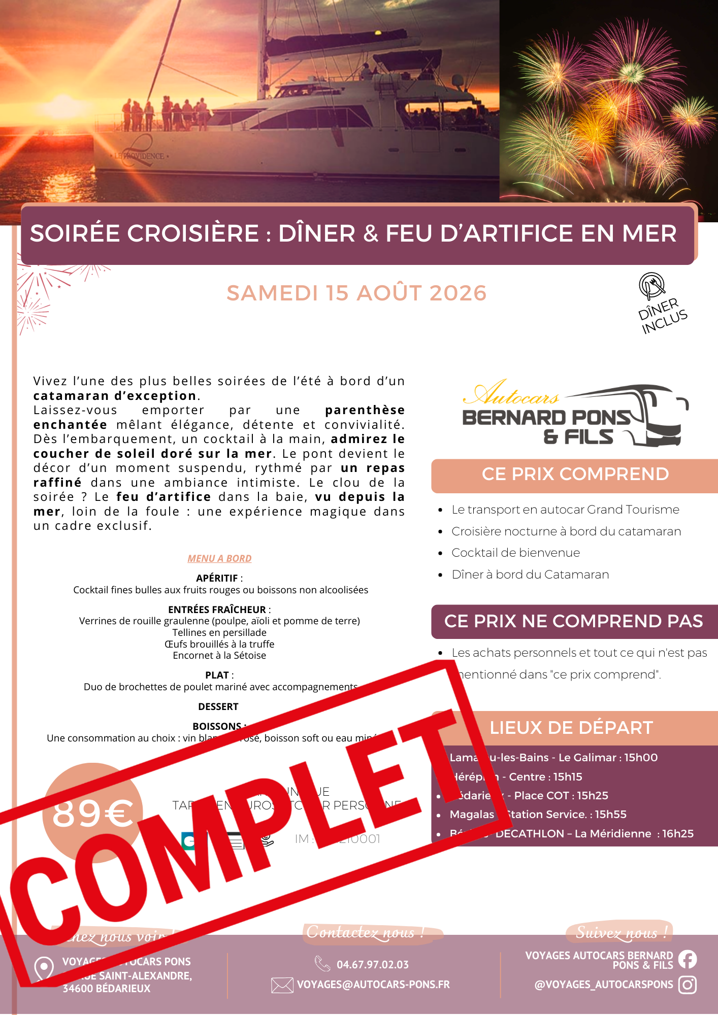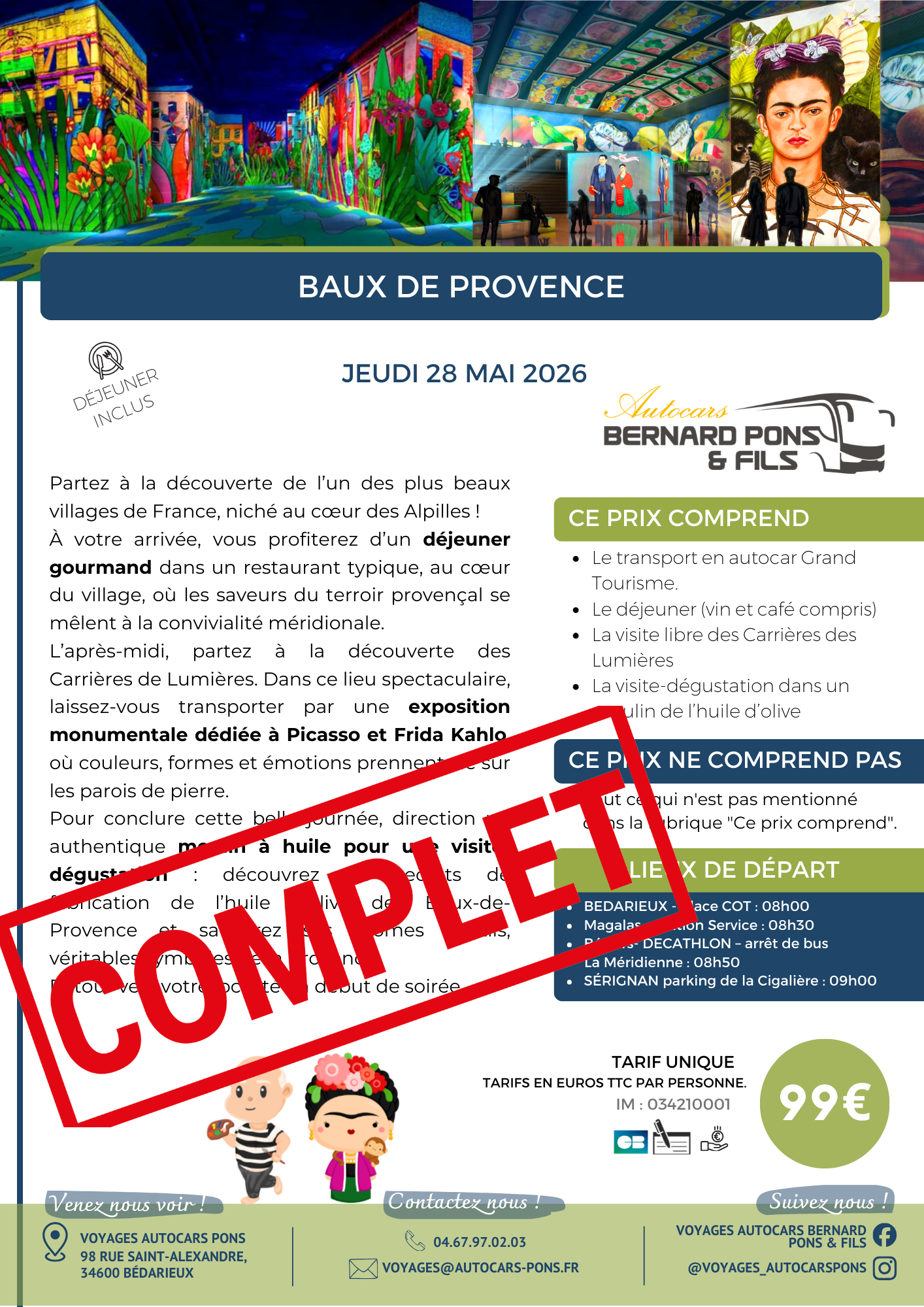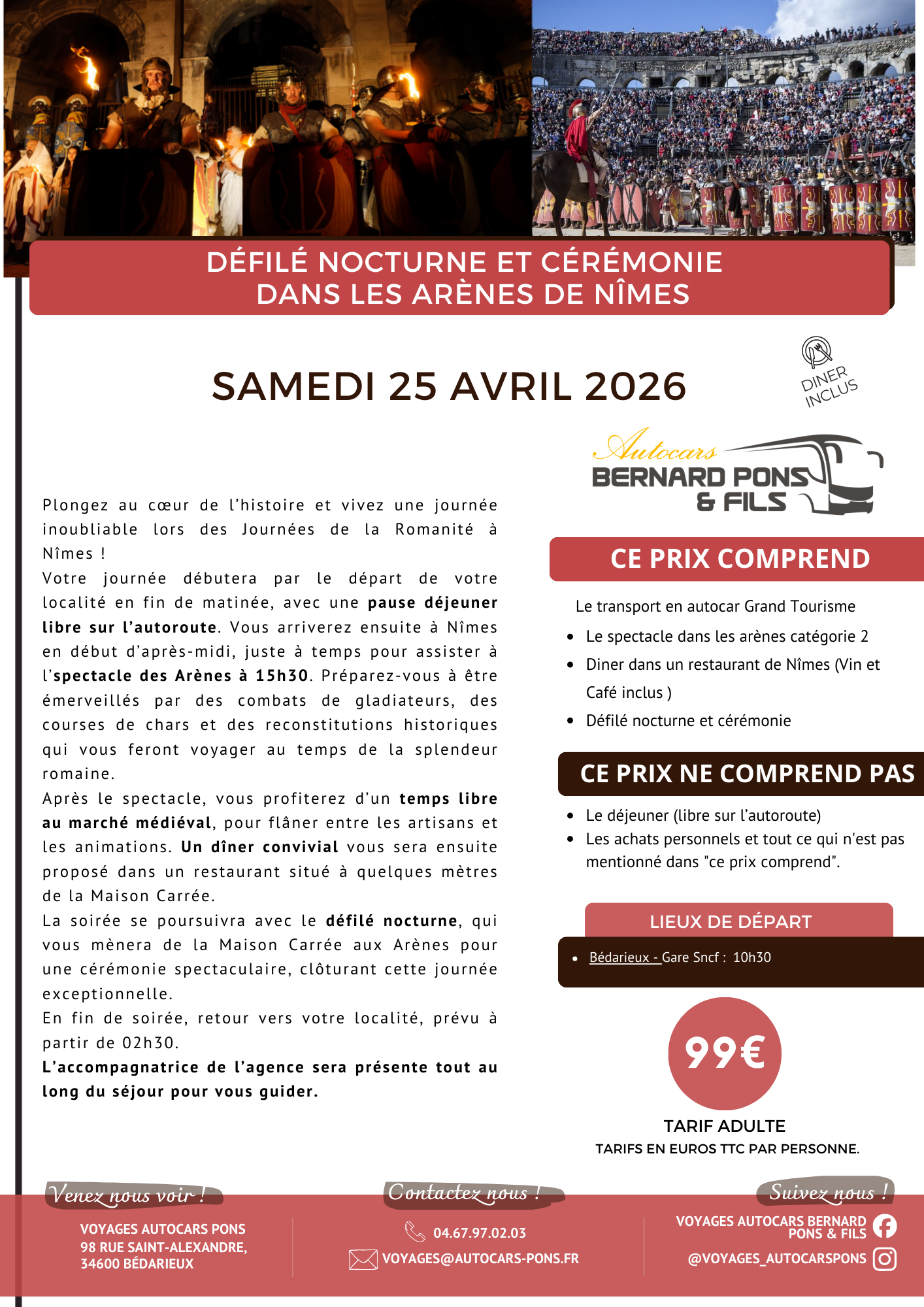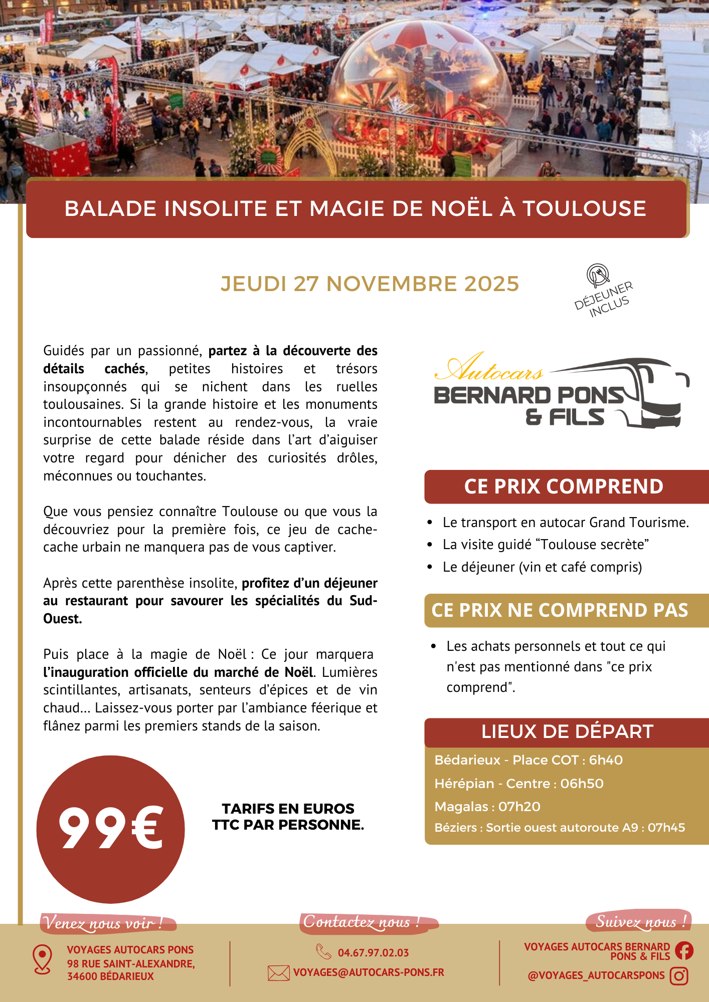Contactez-nous au 04.67.97.02.03 ou par mail à l’adresse : voyages@autocars-pons.fr ou rendez-nous visite à notre agence située au 98 rue Saint-Alexandre, 34600 BEDARIEUX