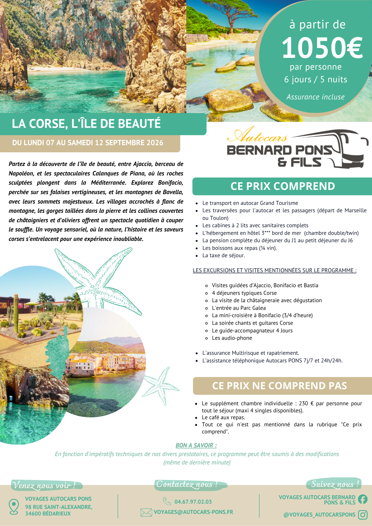 Contactez nous par téléphone au 04.67.97.02.03 ou par mail à l’adresse : voyages@autocars-pons.fr » ou rendez-nous visite à l’agence située au 98 rue Saint-Alexandre à Bédarieux !